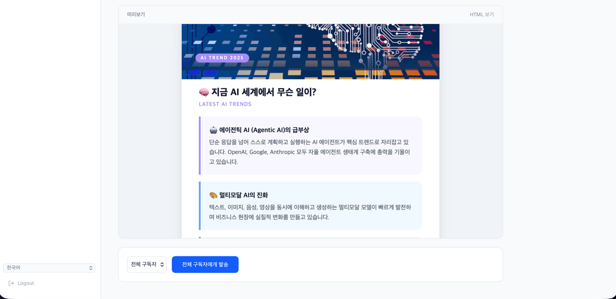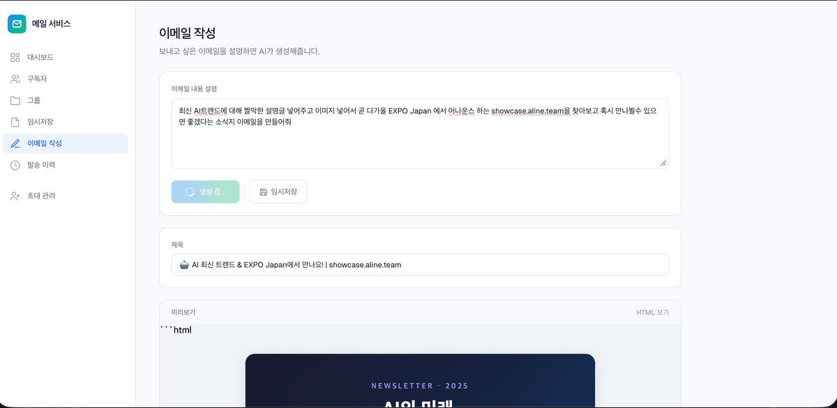 소개 템플릿 편집기 없이 AI로 이메일을 만드는 설치형 뉴스레터 서비스입니다. 보내고 싶은 내용을 자연어로 설명하면 AI가 디자인된 HTML 이메일을 실시간으로 생성합니다. Saa…
